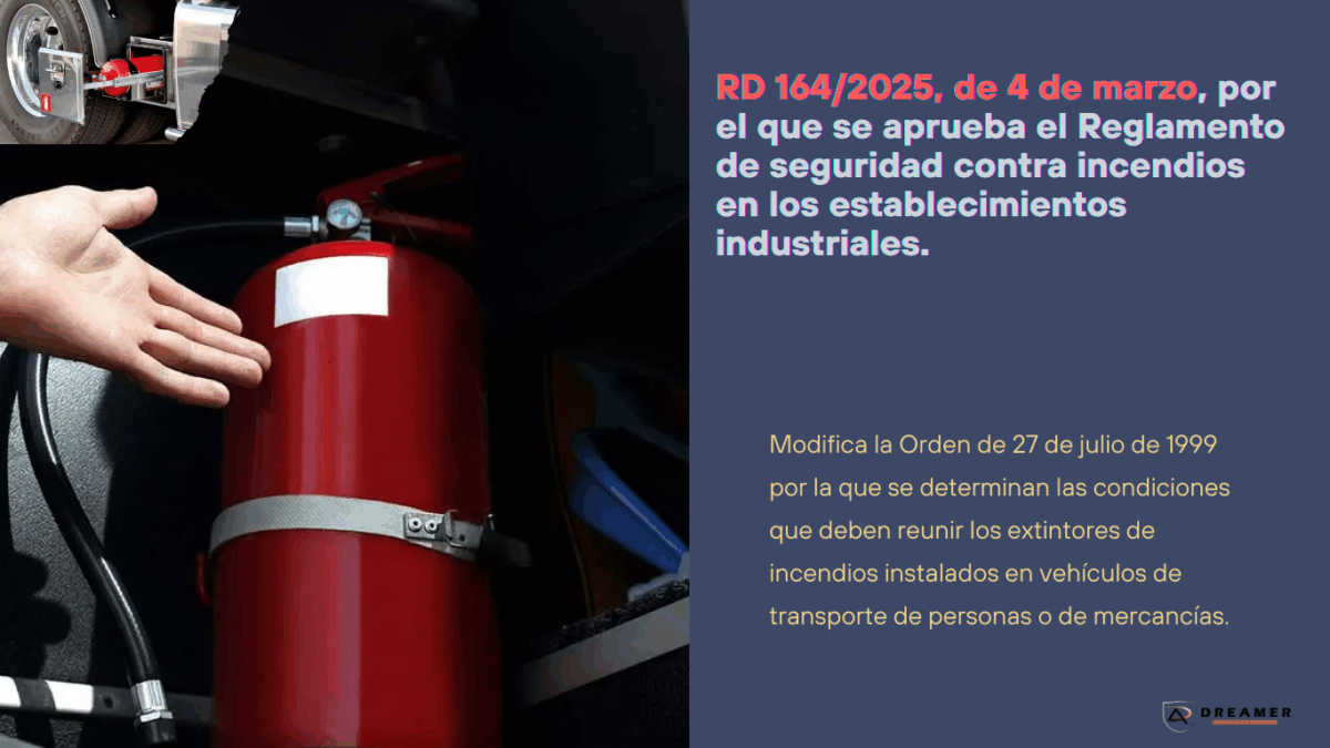 Se ha actualizado la ORDEN de 27 de julio de 1999 (modificada en 2025), que regula qué tipo de extintores deben llevar los vehículos que transportan personas o mercancías, por el Real Decreto 164/2025, de 4 de marzo por el que se aprueba el Reglamento de seguridad contra incendios en los establecimientos industriales.