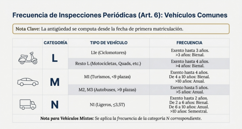 La inspección periódica es la más habitual y su frecuencia depende de dos factores clave: la categoría y la antigüedad de tu vehículo (Artículo 6). No es lo mismo un turismo nuevo que una motocicleta con más de una década de vida.