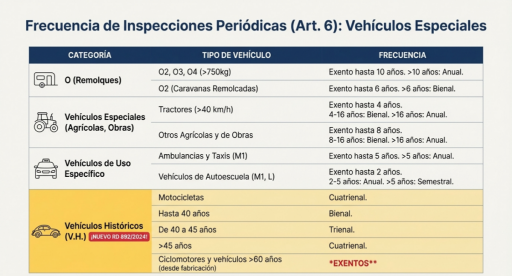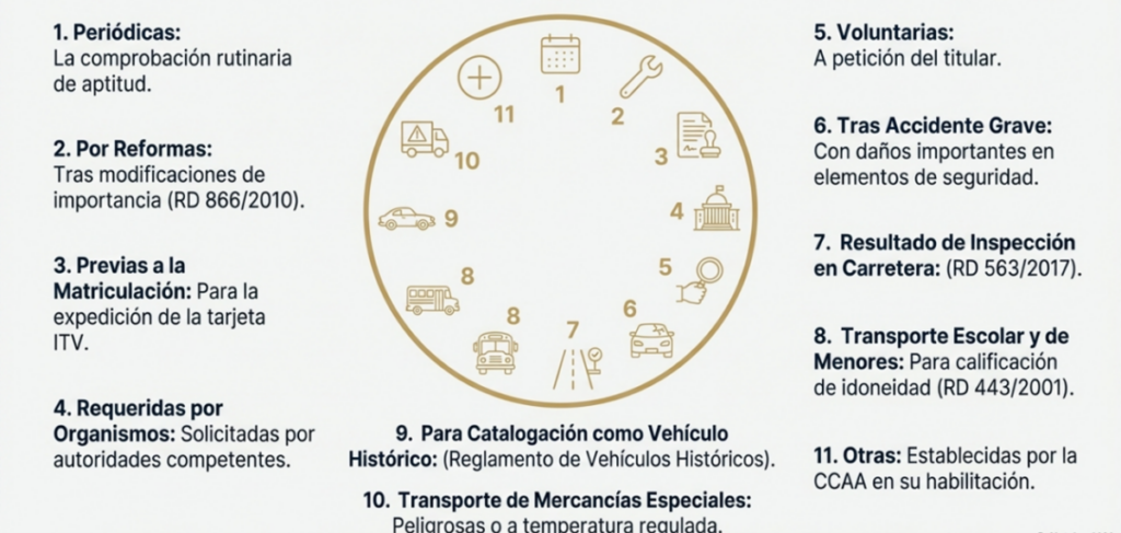 - Vehículos especiales: Existen también inspecciones específicas y más rigurosas para vehículos de transporte escolar o de mercancías peligrosas (Artículos 5.8 y 5.10).
