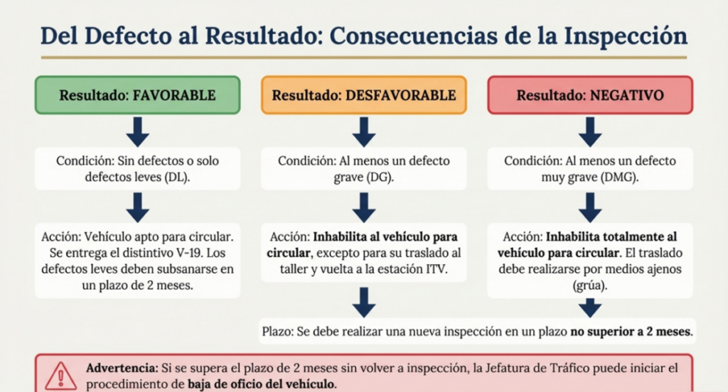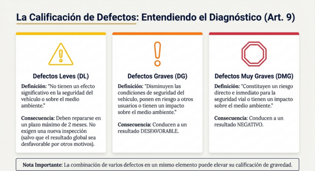 Al finalizar la inspección, la estación emite un informe oficial. El resultado dependerá de la gravedad de los defectos encontrados en tu vehículo (Artículo 9). A continuación, te lo resumimos en una tabla para que lo tengas claro.