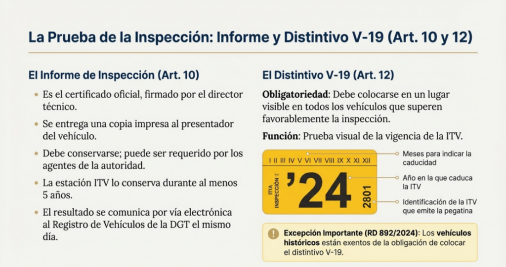 ¿Es obligatorio llevar la pegatina V-19 en el parabrisas? Sí. Los vehículos que superan la inspección deben colocar el distintivo V-19 en un lugar visible, ya que es la prueba de que la inspección ha sido superada (Artículo 12.1). La única excepción son los vehículos históricos, que están exentos de llevarla.
