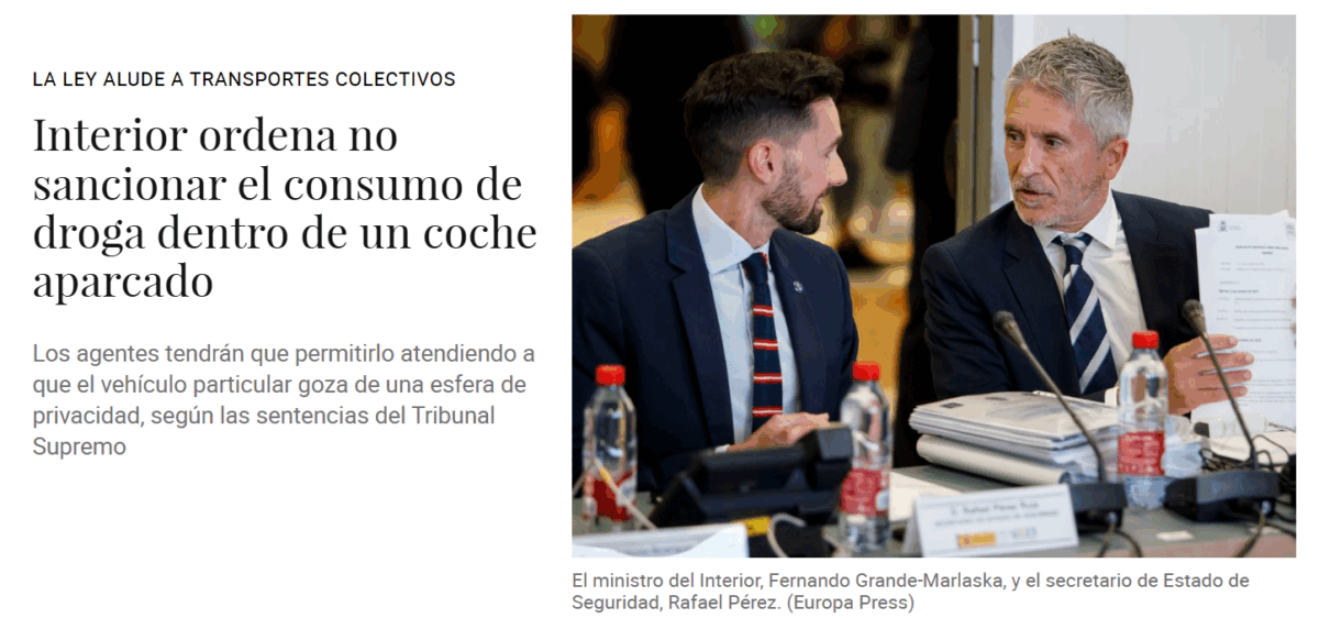 - El punto clave aquí es la redacción del artículo 36.16, que menciona expresamente los transportes colectivos. Esto dejaba al «prudente criterio de los agentes actuantes» decidir si consumir o tener drogas en un vehículo particular estacionado entraba dentro de esta infracción.