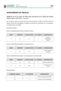 Hoy martes, 12 de enero de 2026 se ha publicado en el DOE (número 12) la Oferta de Empleo Público del AYUNTAMIENTO DE TRUJILLO correspondiente al año 2025, aprobado por Acuerdo de la Junta de Gobierno con fecha 25, donde se incluyen dos plazas de Policía Local.