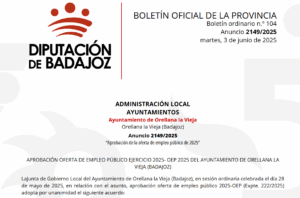 Así se recoge en el BOP de Badajoz nº 104, Anuncio 2149/2025, tras haber sido aprobada por su Junta de Gobierno Local la oferta de empleo público el pasado 28 de mayo de 2025.
